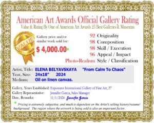 Dynamic and unpredictable nature of life: the contrast between calm and chaos in the piece reflects how external events of internal emotions can shift from peaceful states into moments of turbulence. My work has been featured in numerous exhibitions, including personal and international online shows across Europe and USA and I have had the honor of receiving a silver medal at the International Art Competition “Art, Excellence Award” in Europe, as well as achieving 1st and 2nd places in other art contests. Additionally, I was recognized as a winner in the 2023 “American Art Award” and an official gallery appraisal has valued my work at $ 3,500.