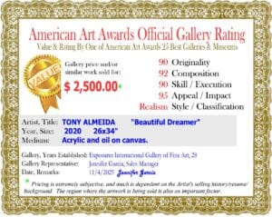 SUBMITTED INFO: TONY ALMEIDA USA “Beautiful Dreamer” www.artbytony.org 2020 26×34″ Acrylic and oil on canvas. Featured in “The American Art Collector Magazine” Competed in Teravarna online Art Contest. Exhibited in the Peabody Auditorium, Daytona Beach, Fl. 2nd Place in 2025 AMERICAN ART AWARDS Floral-Realism.