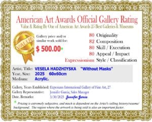SUBMITTED INFO: VESELA HADZHIYSKA BULGARIA www.medhadjiiski.com “Without Masks” 60x60cm Acrylic. 2025 Insight, colors, emotion. Power from nature. Open heart.